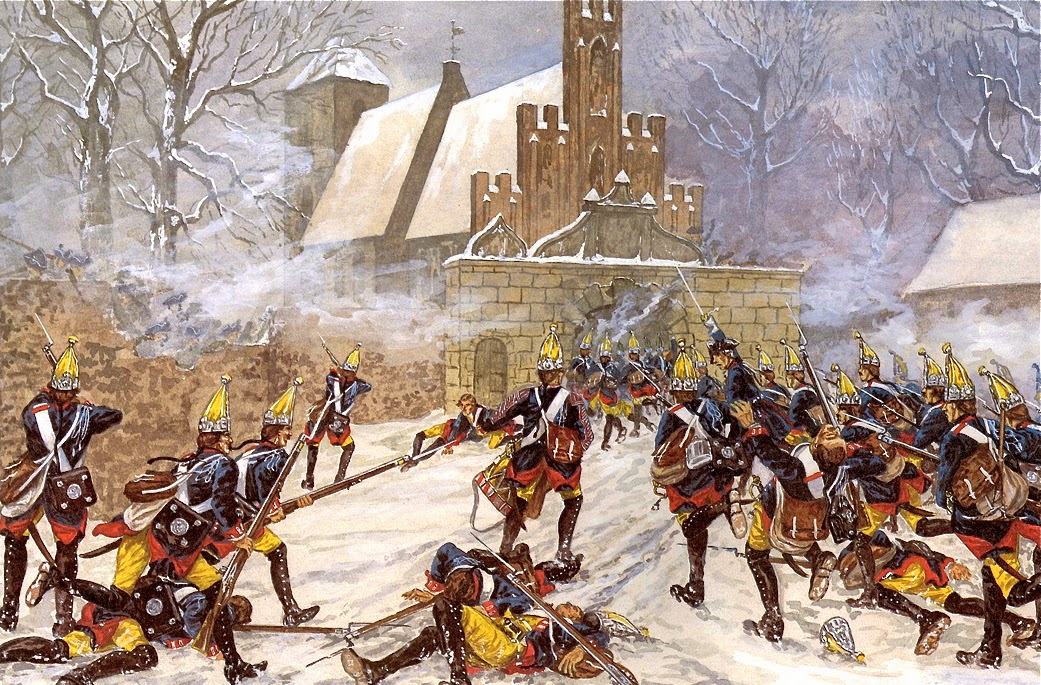It was in the frenzied fighting in 1757 at the Battle of Kolin that Frederick the Great is said to have bawled at Manstein’s flinching Prussian infantry “Dogs! Do you want to live forever?” The surrounded Prussians in a rearguard battle are depicted in this painting by Richard Knötel.