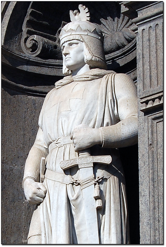 Holy Roman Emperor Frederick II (Kaiser Friedrich II), who was a grandson of legendary Frederick Barbarossa, was very involved with Italy. Due to his father’s death at the age 31, the young Prince Frederick at only 2 years of age was crowned King of Sicily in 1197. In 1212 he was crowned King of the Germans and later crowned as Holy Roman Emperor in 1220. As a Hohenstaufen and grandson of Frederick Barbarossa, he pursued his dynasty’s imperial policies against the Papacy and the Italian city states. He also joined the Sixth Crusade (1228–29), conquering several areas of the Holy Land and crowned himself King of Jerusalem (reigning 1229–43).