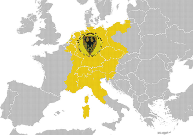 After the death of Charlemagne, the Empire split into West Frankia… which gradually became France…and East Frankia which continued as the German Holy Roman Empire. In 962 the Empire was reconfirmed by Otto I, who consolidated control over the autonomous stem duchies of Franconia, Bavaria, Swabia, Saxony, and Lotharingia. The single headed eagle was the coat of arms of the Empire until 1440, when the two headed eagle was adopted, signifying that the empire was both spiritual and secular.