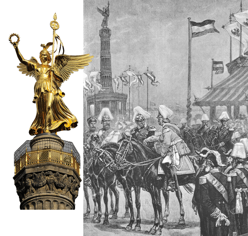The inauguration of the Berlin Siegessäule (Victory Column) is depicted here in an 1873 artist’s rendering of the ceremony conducted by Kaiser Wilhelm I…the image in gold is a close up of the Victoria statue atop the column, as it appears today.
