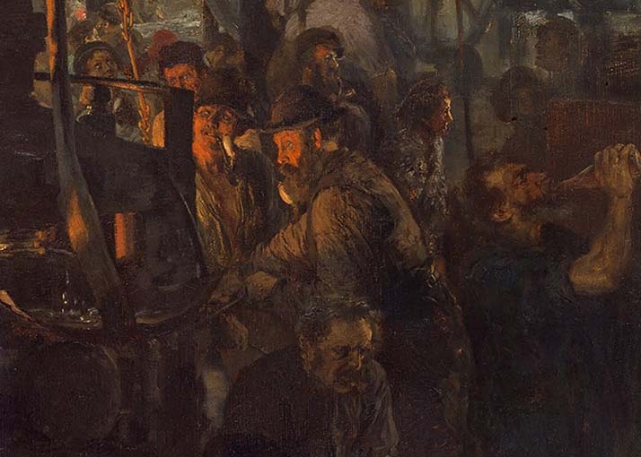 The very large painting was based on more than 100 drawings, made during a stay of several weeks in the Upper Silesian iron mill at Königshütte, the second largest and most modern industrial area in Germany (after the Ruhrgebiet). The Iron Mill was “the” symbol of the industrial age…three thousand workers at seven blast furnaces producing tons of bar iron and steel for the railways. Menzel’s aim in this painting was to show the complicated technical details of the Mill as well as the dramatic effect of the raging fire in open furnaces.
