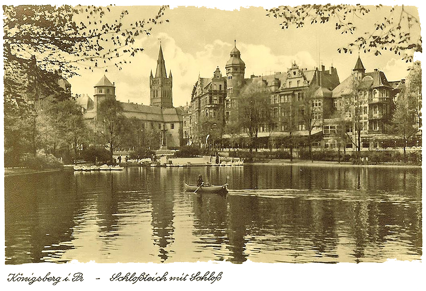 My parents lived in Königsberg and were married there in 1940. The city was the capital of East Prussia in Germany. I remember a photo of them in 1937 in a rowboat on this large castle lagoon, the one pictured here. And stories of how they had dinner in the somewhat spooky Königsberg Castle’s Blutgericht (Blood Court), a restaurant in a space once used in medieval times by the Teutonic Knights as a courtroom for capital crimes. And how they would go to the famous Café Schwermer and sit there for hours just talking, slowly nursing their Kaffee und Kuchen, under the massive old oaks that shaded the outdoor seating area in summers,
