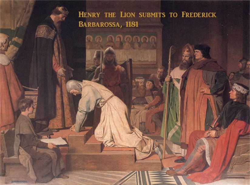 The image below depicts the moment that Henry the Lion submits to Frederick Barbarossa, 1181 in Erfurt. The painting is by Peter Janssen, 1882, entitled “Unterwerfung Heinrichs des Löwen vor Kaiser Friedrich I. Barbarossa in der Erfurter Peterskirche im Jahre 1181”.