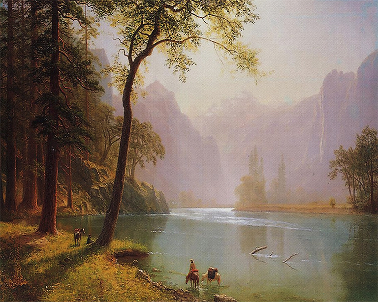 This night time scene was painted in 1869 by Albert Bierstadt, a German artist who was drawn to the American frontier as were many other Germans in the 19th century. The painting shows a group of Oregon bound pioneers and captures the romance of the American West. Its a glimpse of the pioneers at a campsite alongside a shimmering river, under a canopy of large trees trees, and all of lit by the warm glow of the campfire. A full moon is visible in the clear sky.