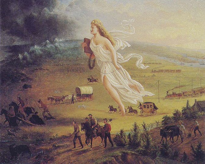 John Gast painted a popular scene of people moving west that captured the view of Americans at the time. Called “Spirit of the Frontier” and widely distributed as an engraving, it portrayed settlers moving west, guided and protected by a goddess-like figure of Columbia and aided by technology (railways, telegraphs), driving Native Americans and bison into obscurity. It is also important to note that the angel is bringing the “light” as witnessed on the eastern side of the painting as she travels towards the “darkened” west.