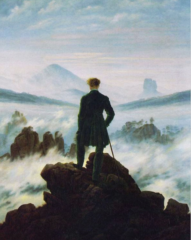 Caspar Friedrich’s “Lebensstufen”,representing our various Life Stages by the distances of ships on the vast sea of life. Once again Friedrich uses the so-called Rückenfigur …a prominently placed figure shown entirely from the back … which is a commentary on the Romantic experience of art and nature. The world can only be glimpsed, experienced, and reproduced from a single point of view, in fragments, never as complete and whole in and of itself.