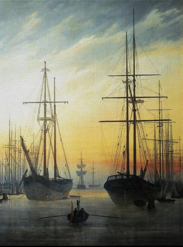 Wanderer above a Sea of Fog, by Caspar FriedrichCaspar David Friedrich, On board a Sailing Ship…Friedrich was on his honeymoon in 1818 with the woman in the eye-catching red dress, his bride Caroline.Old Sailing Ship in Harbor by Caspar FriedrichMondaufgang am Meer (Moonrise over the sea), by Caspar Friedrich 1822