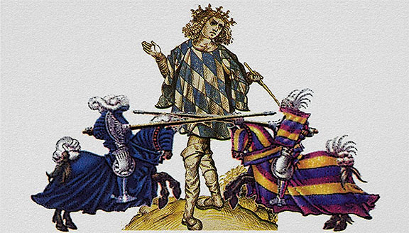The wand held by Jörg Rugen was an important tool, used by Heralds to gain attention and make grand gestures. His tabard with the white-and-blue lozenges design, was originally the coat of arms of the Counts of Bogen, adopted in 1247 by the House of Wittelsbach, rulers of Bavaria for 738 years.