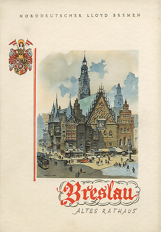 This is an artist’s rendering of Breslau’s Old City Hall, from an early 20th century series of prints used by the Norddeutscher Lloyd (North German Lloyd) ship company, operating out of Bremen, Germany. The city of Breslau in Silesia has a long German history, but it is no longer part of Germany. It’s the same fate that befell East Prussia. The United States, Britain and Russia decreed in 1945 that the eastern parts of Germany… despite being German for 700 years… should become Russian, Polish and Lithuanian.