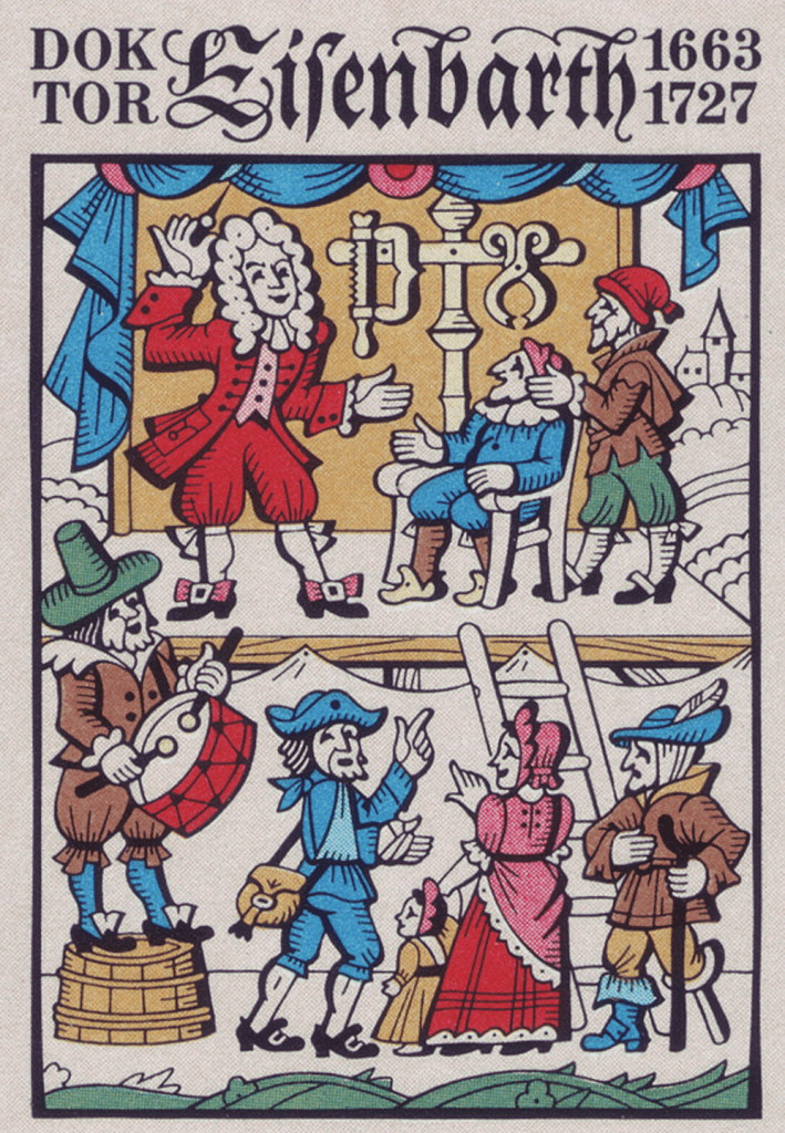 When I recently saw the name Dr. Eisenbarth, I immediately recalled a melodious tune from my childhood: “Ich bin der Doktor Eisenbarth, Ja, Ja, Ja..” …that song still sits in my memory and suddenly spilled out. It is fascinating to learn that there actually was a real person named Johann Eisenbarth in the late 1600’s and early 1700’s who achieved great success and fame as a travelling surgeon in Prussia.