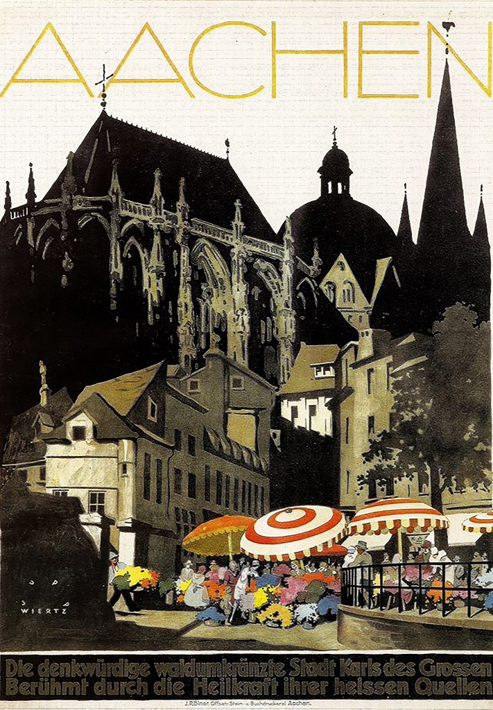 This vintage 1928 advertising poster for Aachen, Germany was created by Jupp Wiertz, one of Germany’s foremost graphic artists… an image of his hometown. Text on this poster translates to: Aachen…The memorable forest encircled city of Charlemagne, famous for its healthful natural hot springs.