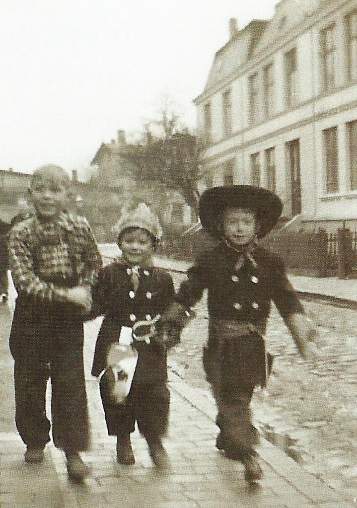 This vintage photo from post war Lübeck in northern Germany is not the best quality but it shows that even in those hard times, little German kids loved to dress up like Cowboys und Indianer. Looking at this now I have to laugh at my brother’s Indian outfit…that white holster just did not look right. Nevertheless, we were proud to show off our Christmas presents and looked exotic enough to attract a neighborhood boy who was inspired to join our little parade.