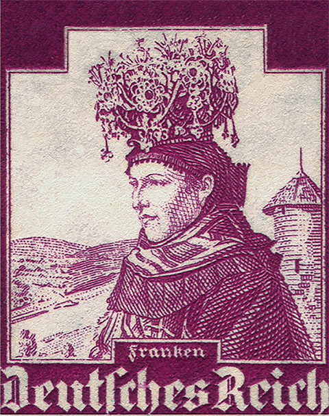 These Trachten, or folk costumes, represent 10 areas of old Germany… these images were used on a series of postage stamps issued early in the 20th century Germany.